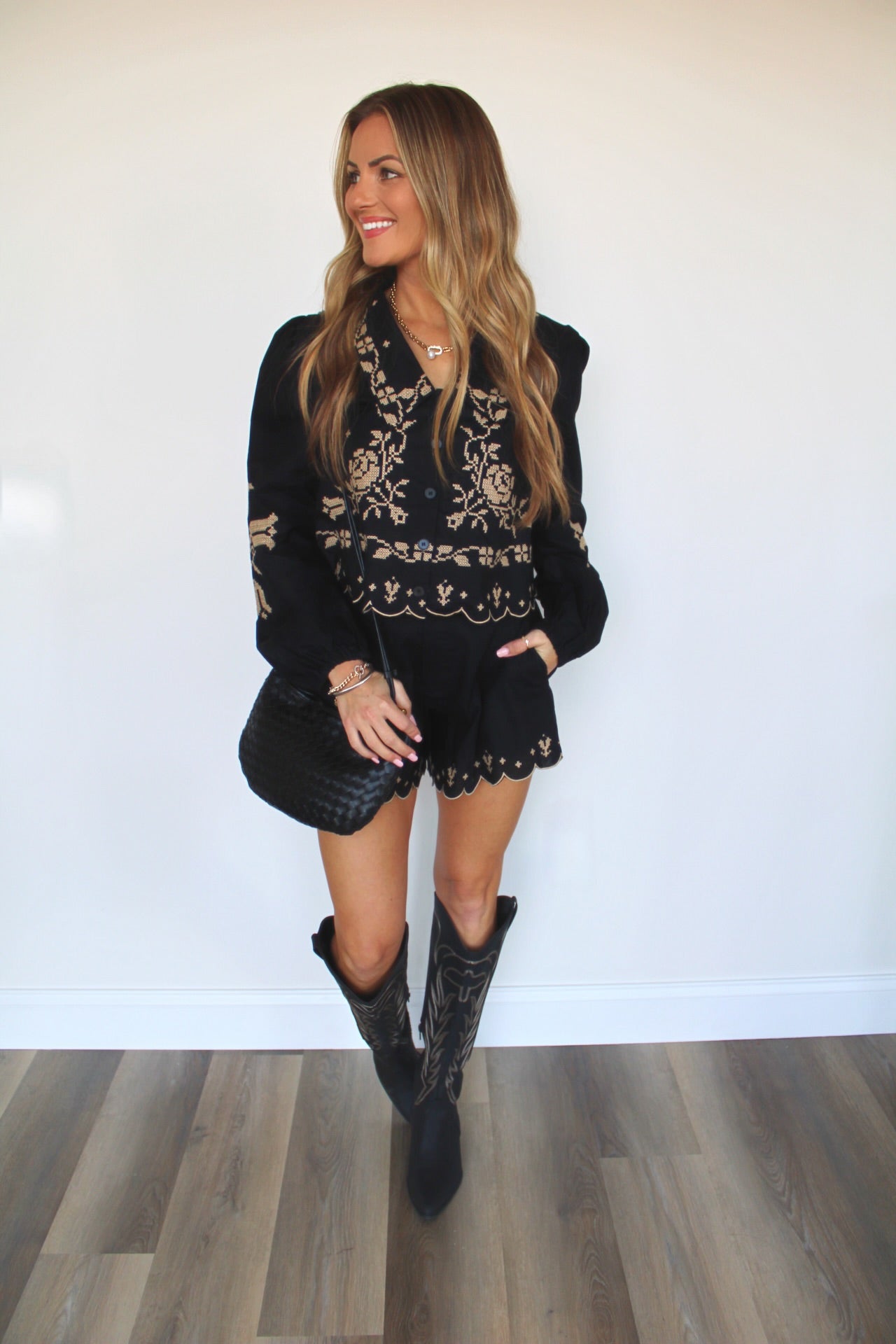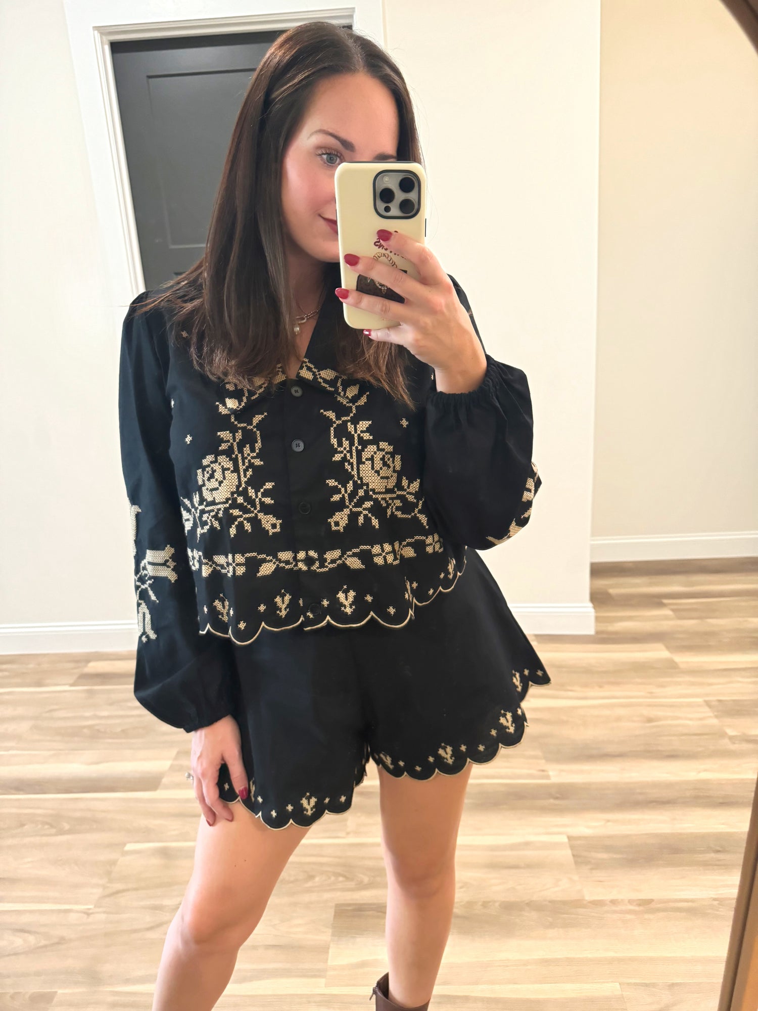 Elevate your style with this chic two-piece set that combines timeless elegance with modern flair. The set features a delicate floral embroidery that adds a touch of sophistication to both the top and shorts, creating a coordinated look that’s effortlessly stylish. The top has a flattering, relaxed fit with a scalloped hem that gives it a soft, feminine edge, while the long sleeves add just the right amount of coverage. The matching shorts also boast a scalloped edge, enhancing the romantic vibe and giving the set a seamless look. Perfect for brunch dates, weekend outings, or cozy holiday gatherings, this ensemble is a must-have for those who want to stand out with subtle charm. Embrace this versatile set and make it a staple in your wardrobe!