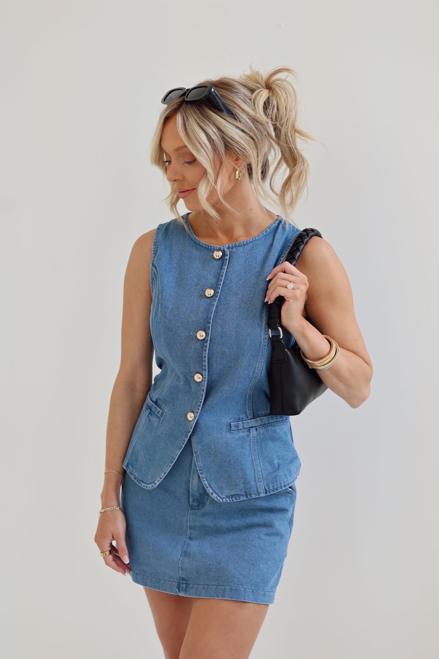 Sets are IN, and this denim duo is stealing the show! Flirty, fun, and effortlessly chic, our Blue Crush Denim 2-Piece Set is your new go-to for spring and summer style. Featuring a structured, button-up vest with functional gold buttons (because who doesn’t love a little glam?), plus a matching high-waisted denim skirt, this outfit is a total game-changer.