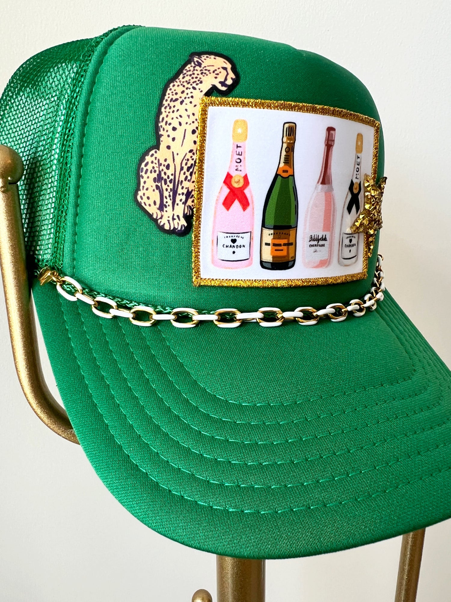 Unleash your wild side with our Born To Be Wild Trucker Hat! Featuring a bold Kelly Green color, a chic champagne patch with a fierce leopard and gold star design, and finished off with a luxurious gold and white linked chain across the front. The perfect trendy addition to any outfit!