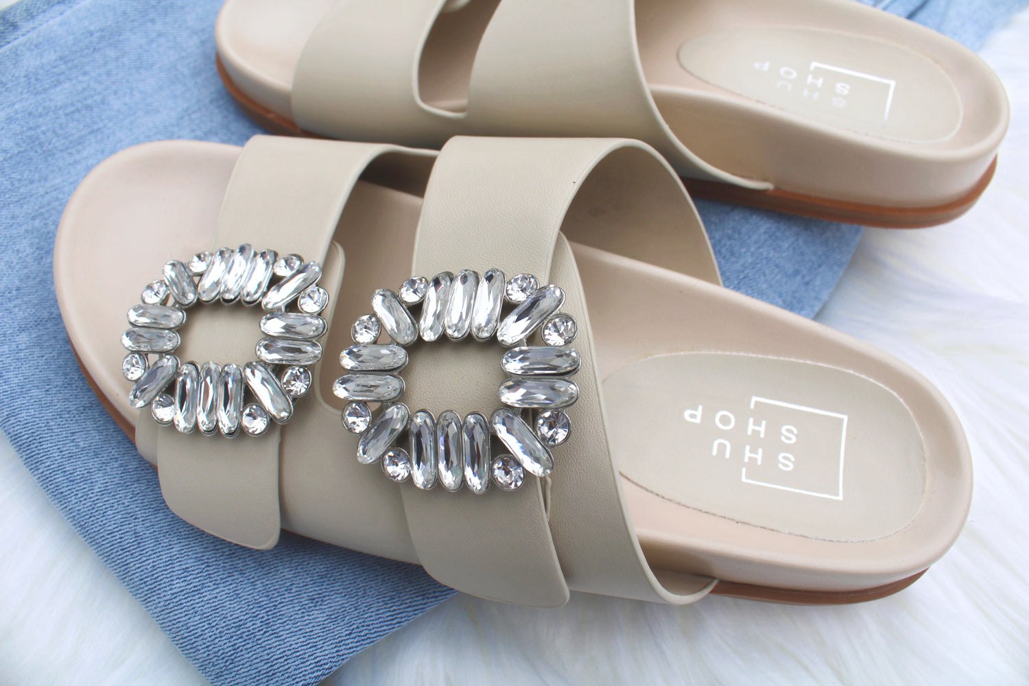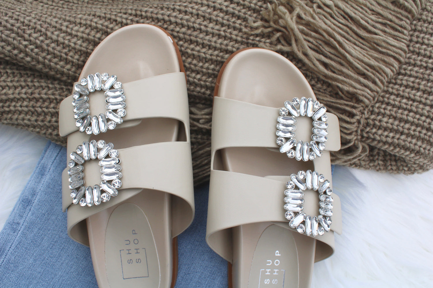 Our Bridget slip-on sandals are crafted from super soft faux leather. This pair features a comfortable molded footbed and is crowned by two rhinestone buckles embellished with crystals. Perfect for everyday wear sandals during the spring & summer - or dress them up on a beach vaca!