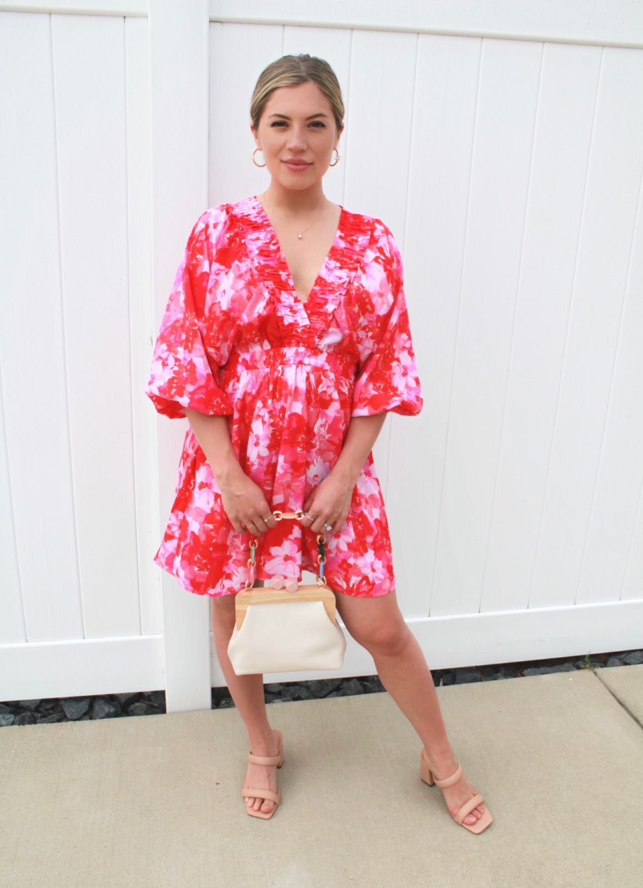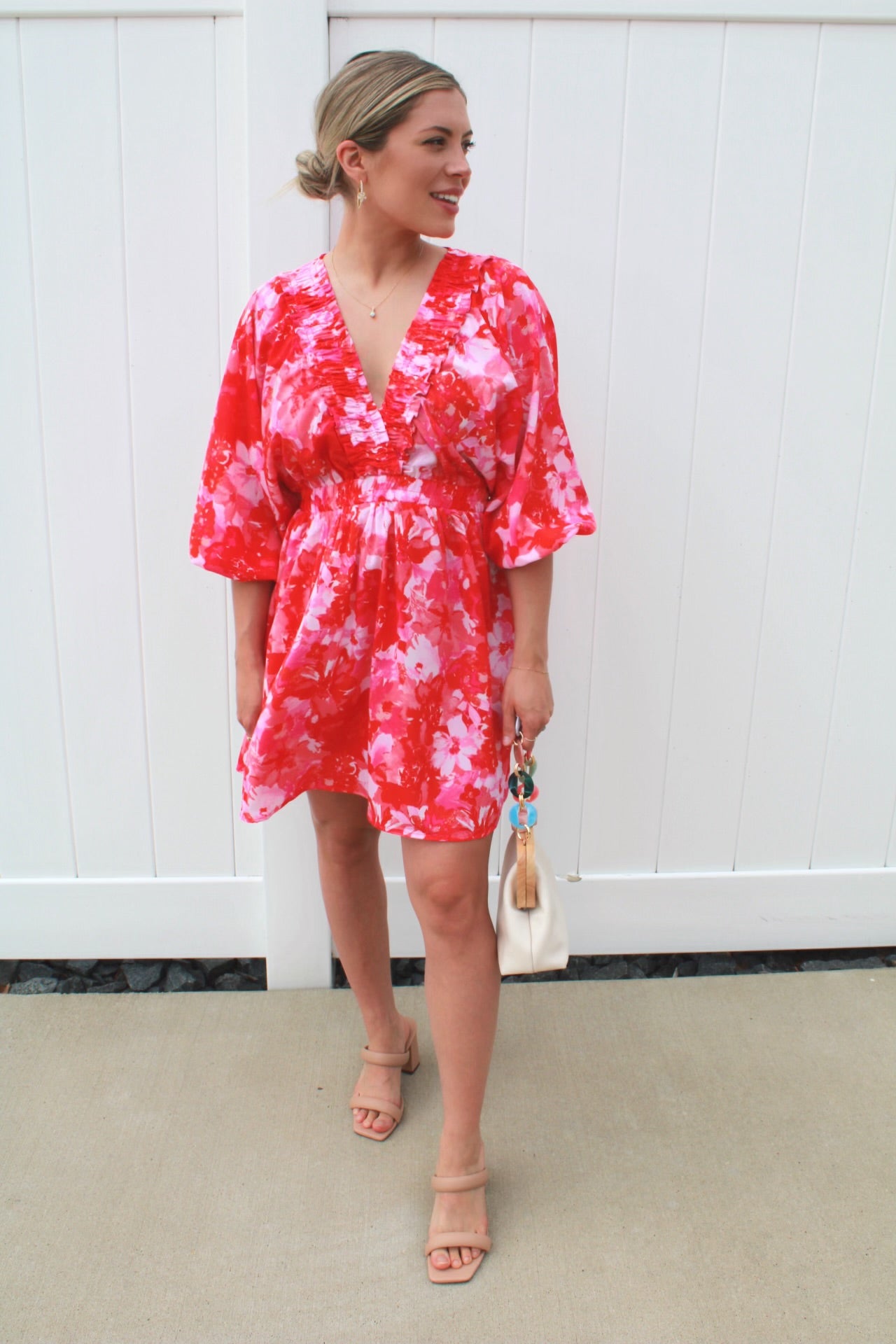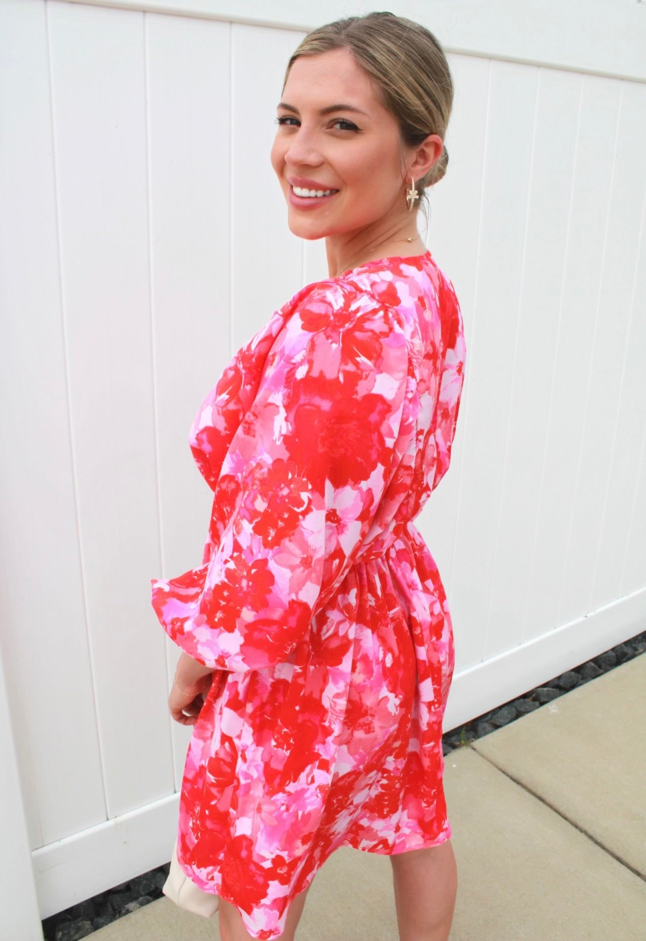 Get ready to turn heads in the Jacelyn Floral Print Mini Dress! This stunning dress features a bold fuschia and red floral print, with smocking detail along the waist and v cut chest area. The 3/4 length sleeves add a touch of elegance to any occasion, making it perfect for date night, cocktail attire, or a girls' night out!
