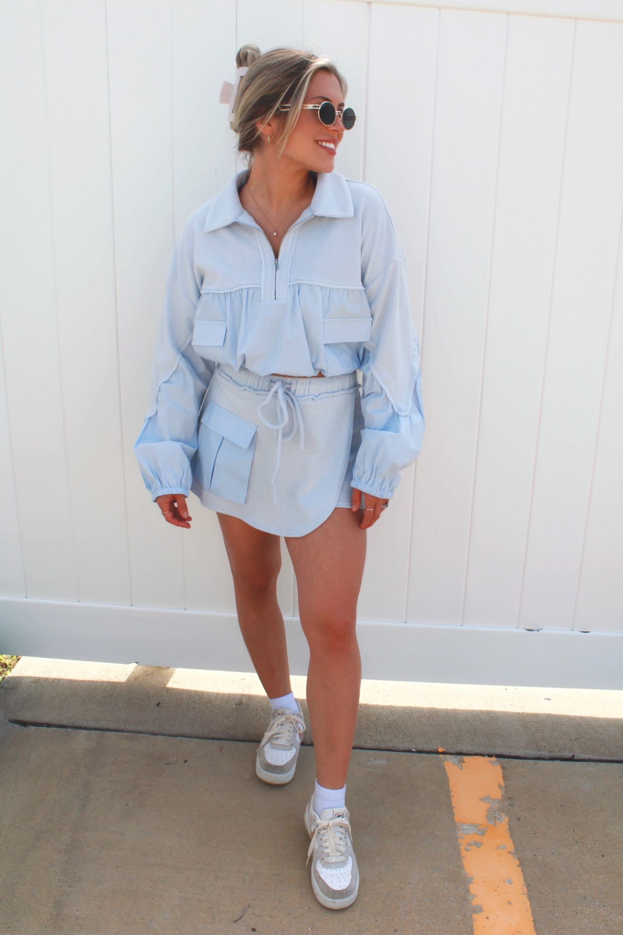 The Jaclyn Cotton Terry Top features a luxurious cotton terry fabric that offers both comfort and style. The blue contrast and raw edge detail add a touch of uniqueness, while the functional half zipper and pockets provide practicality. The collar and balloon long sleeves with elastic cuffs bring a chic and trendy touch to this slightly cropped top. Elevate your wardrobe with this must-have piece! We love this paired with the Jaclyn Cotton Terry Matching Skort and sneakers for a trendy and casual look!