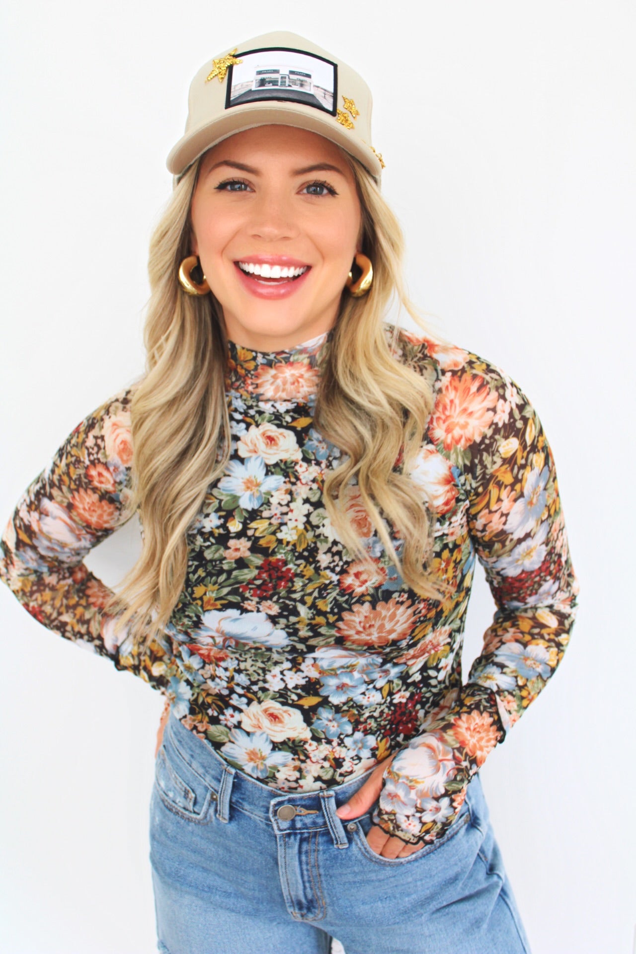 Embrace the spirit of the season with this tops floral print accented by bright accenting hues of dusty blue, dark orange, red, dark yellow, green, and sage — all set against an irresistible black background. The mock neckline gives a sense of drama while the ripple hem adds a glimmer of style. Complete the look with its long sleeves that come with thumbholes for maximum comfort and breathability — perfect for the cooler months ahead.
