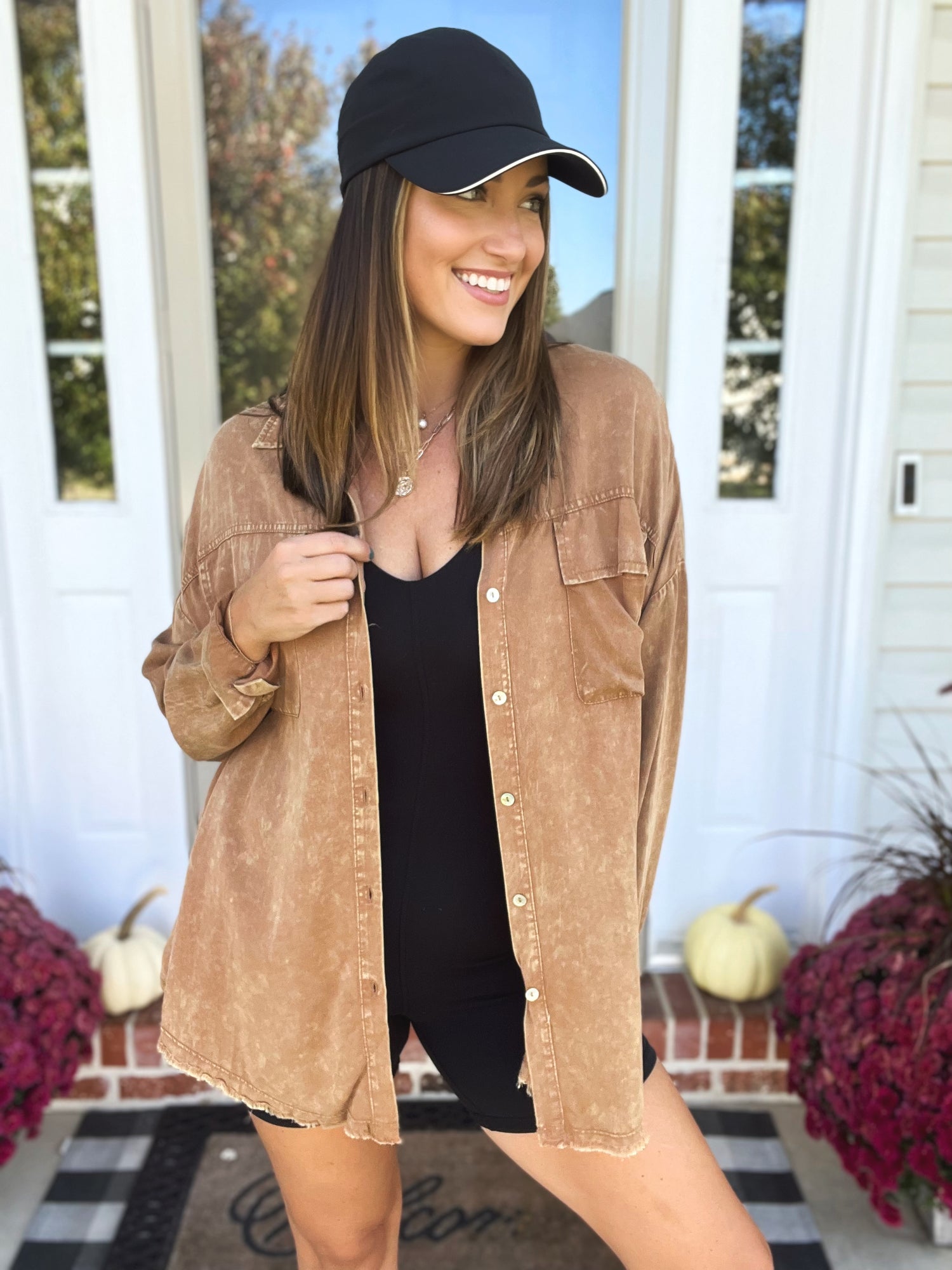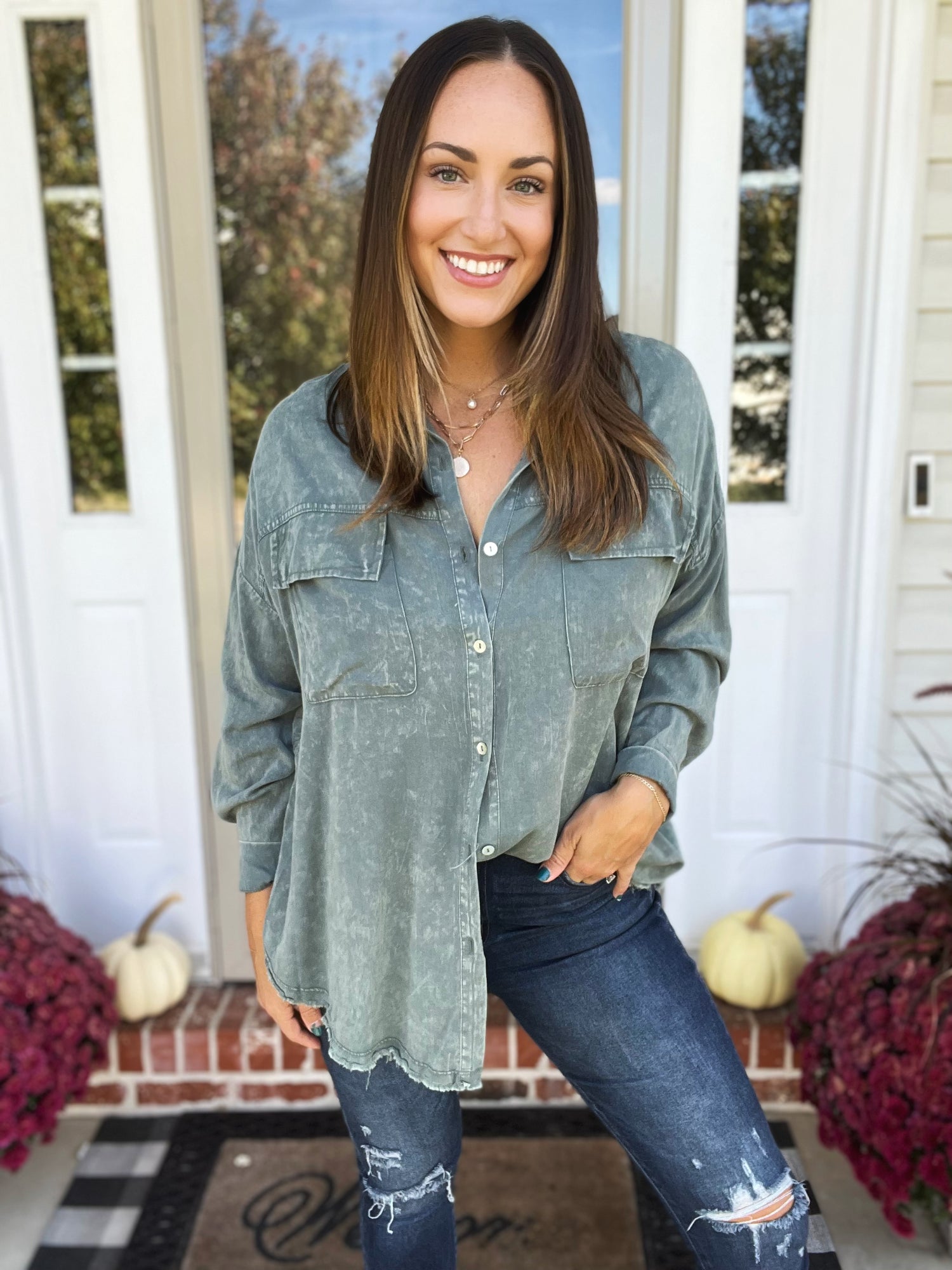 Never sacrifice style for comfort! This Mineral Wash Button Up is lightweight and features a mineral wash fabric for a unique look. With its functional buttons and front pockets, you can feel confident with the versatility of this shirt/jacket. Unfinished frayed hem accents the bottom for a modern and stylish touch