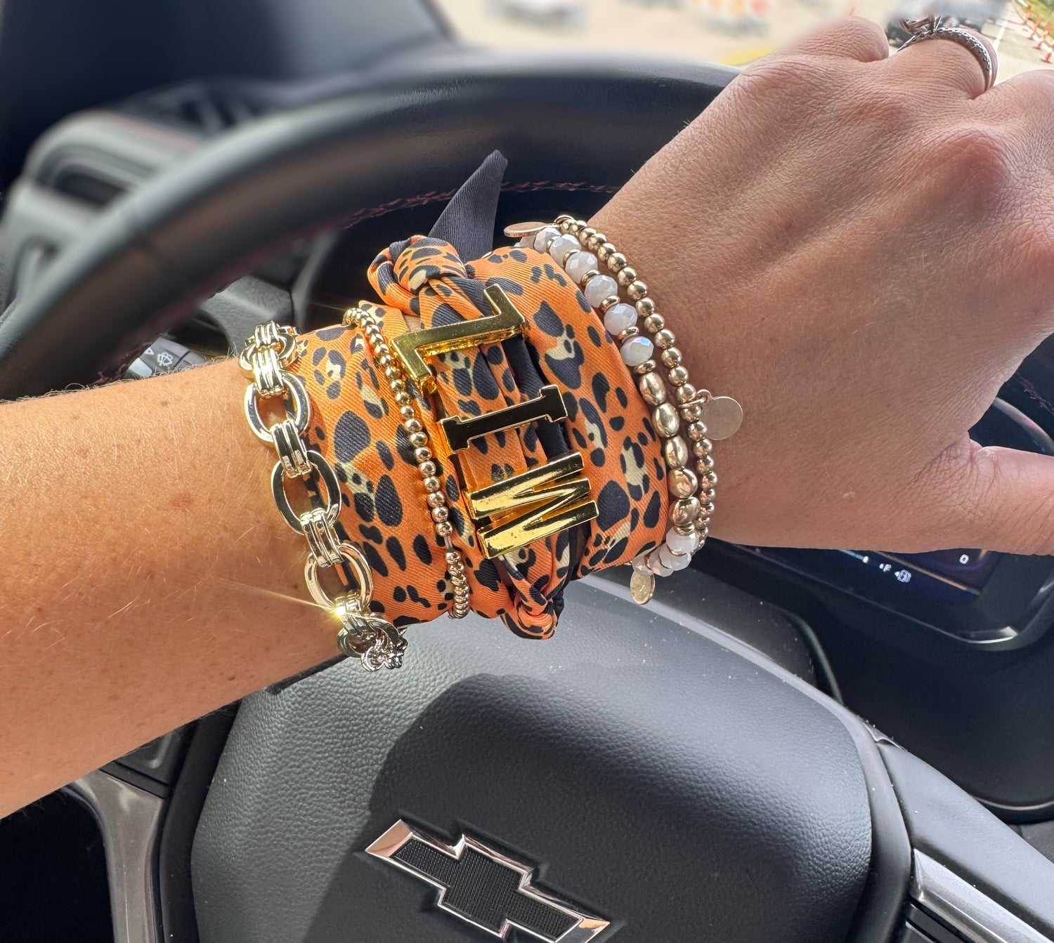 Game day just got a major upgrade. Our M-I-Z Scarf Bracelet is the ultimate statement piece for every true fan. Wrapped in bold leopard print with luxe gold letters included, this bracelet is the perfect mix of sporty + chic. Whether you’re tailgating, cheering from the stands, or just showing off your team pride, this piece adds the perfect pop to your game day fit.