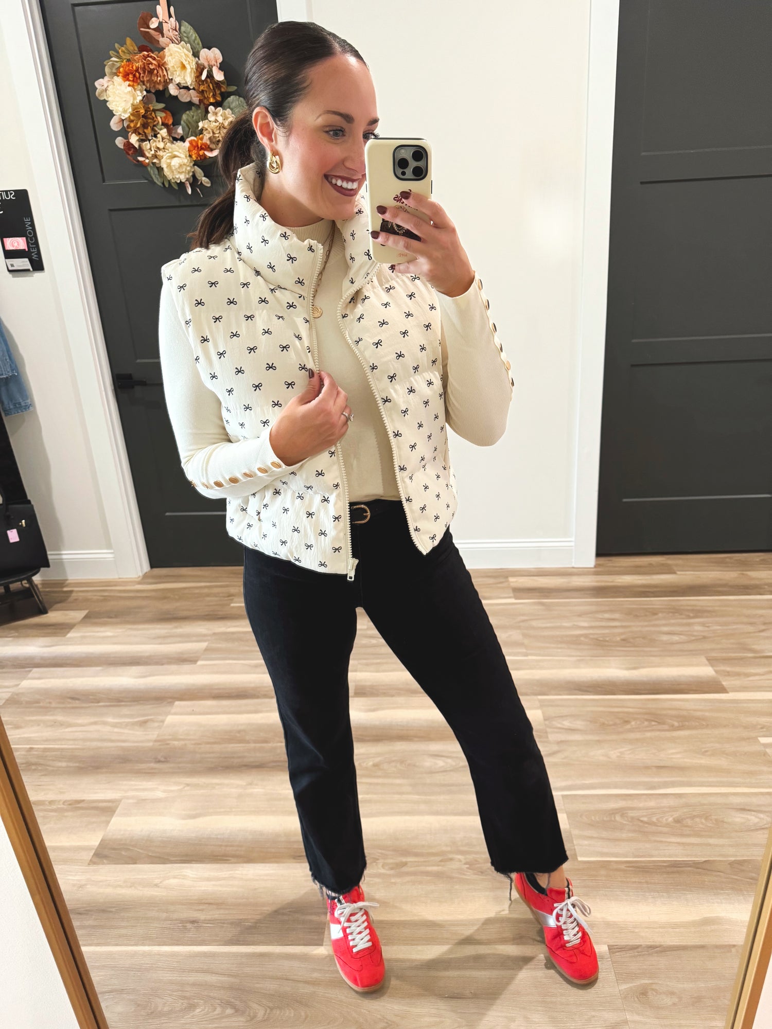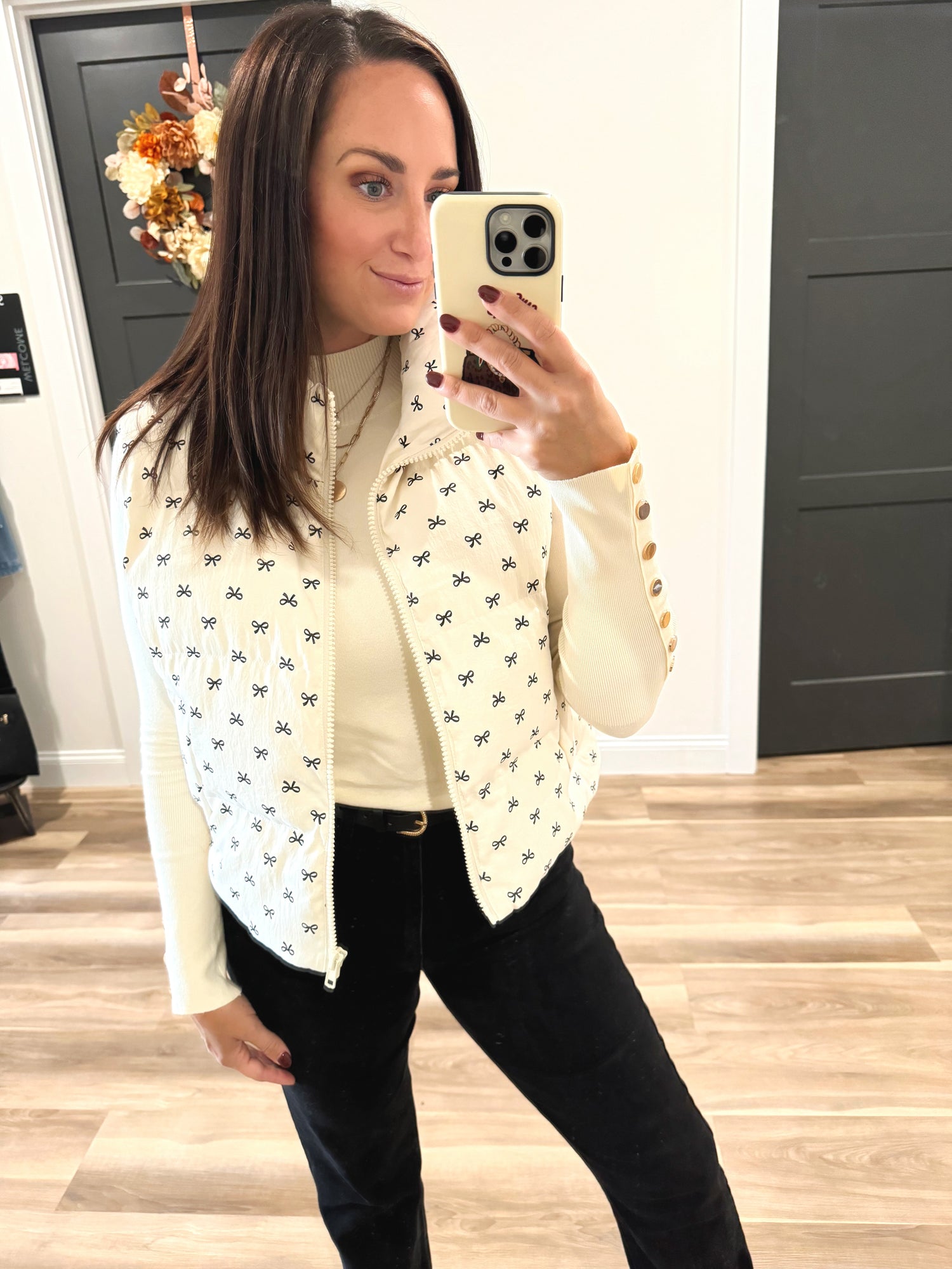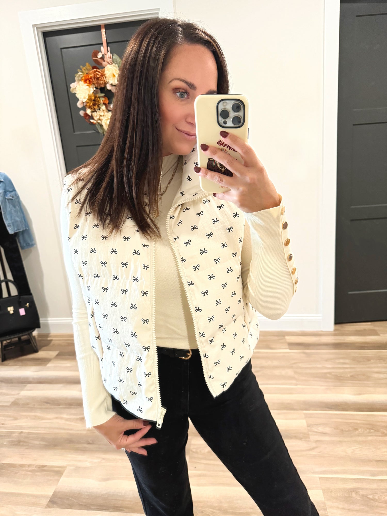 Meet your new wardrobe favorite: this chic and cozy vest! Featuring an elegant pattern of tiny bows on a creamy white background, it adds the perfect touch of charm to any outfit. The high-quality fabric ensures warmth and comfort, making it an ideal layering piece for those cooler days. With its tailored fit and stylish design, this vest is as versatile as it is eye-catching—dress it up or down to suit any occasion. Make this must-have piece yours and elevate your fall and winter looks!