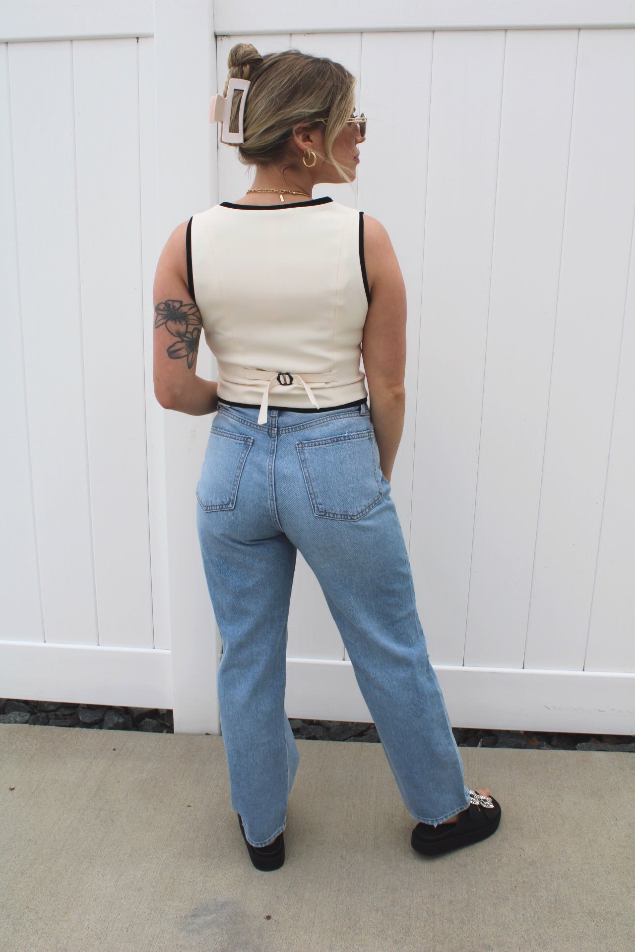 This timeless and classy set is a must have for the spring & summer season! The cream color with black contrast edge detail is a trendy look perfect for any occasion. Keep it casual with black & white dunks & layered gold jewelry, or dress it up with black wedges and a blazer!
