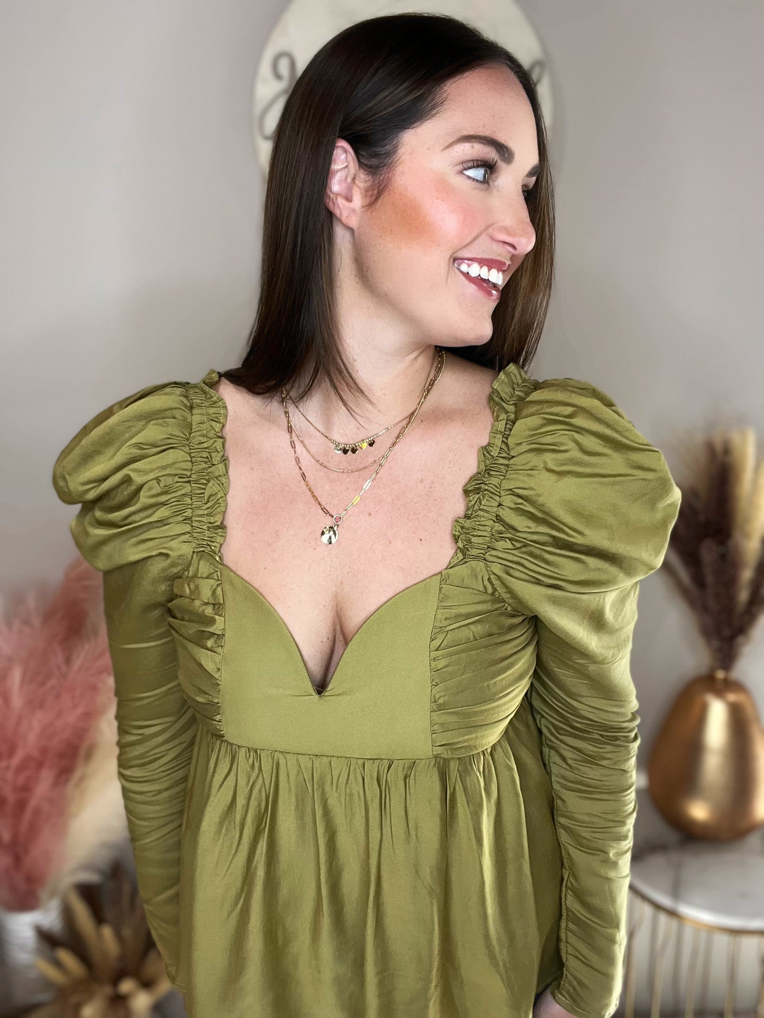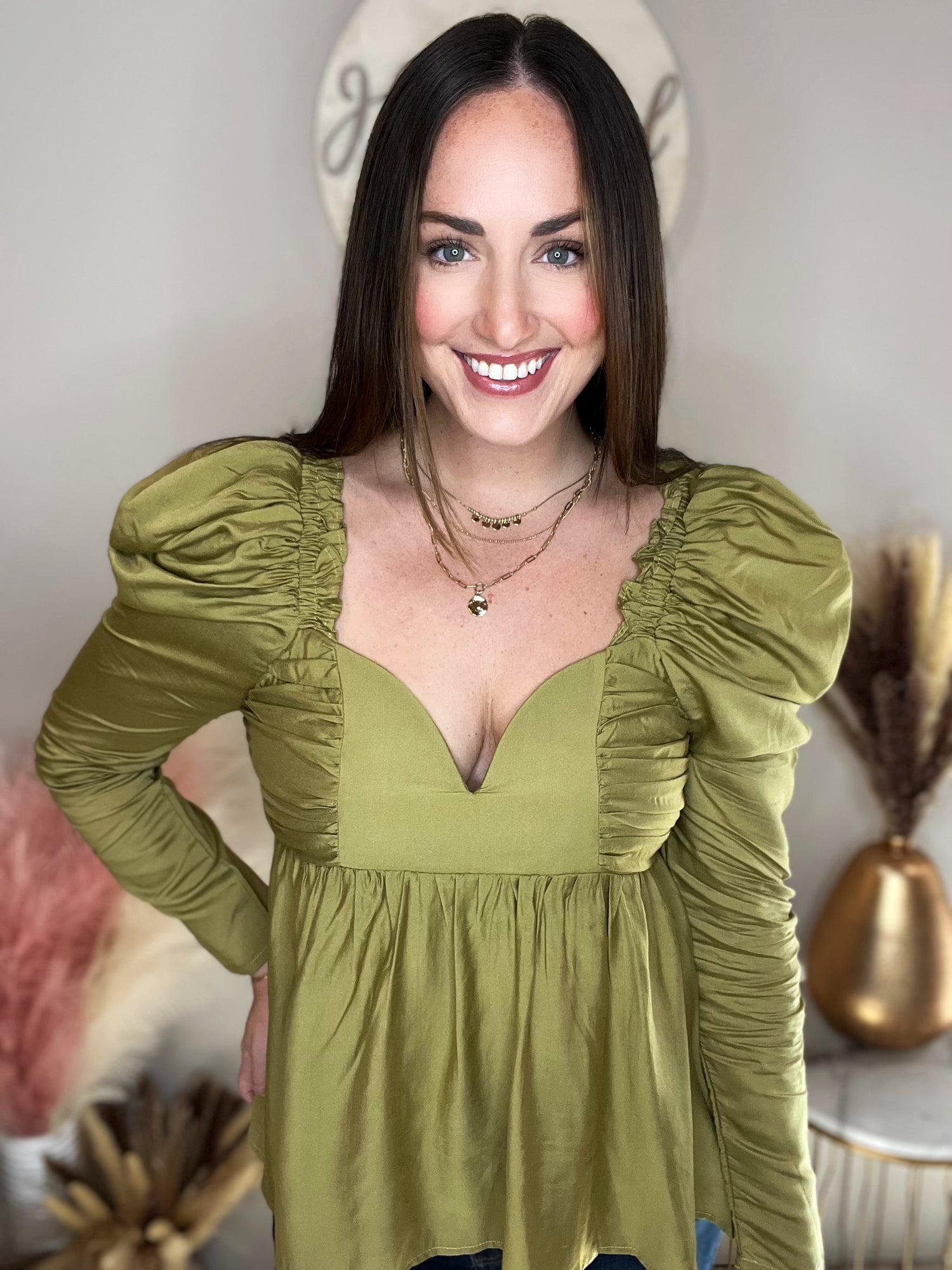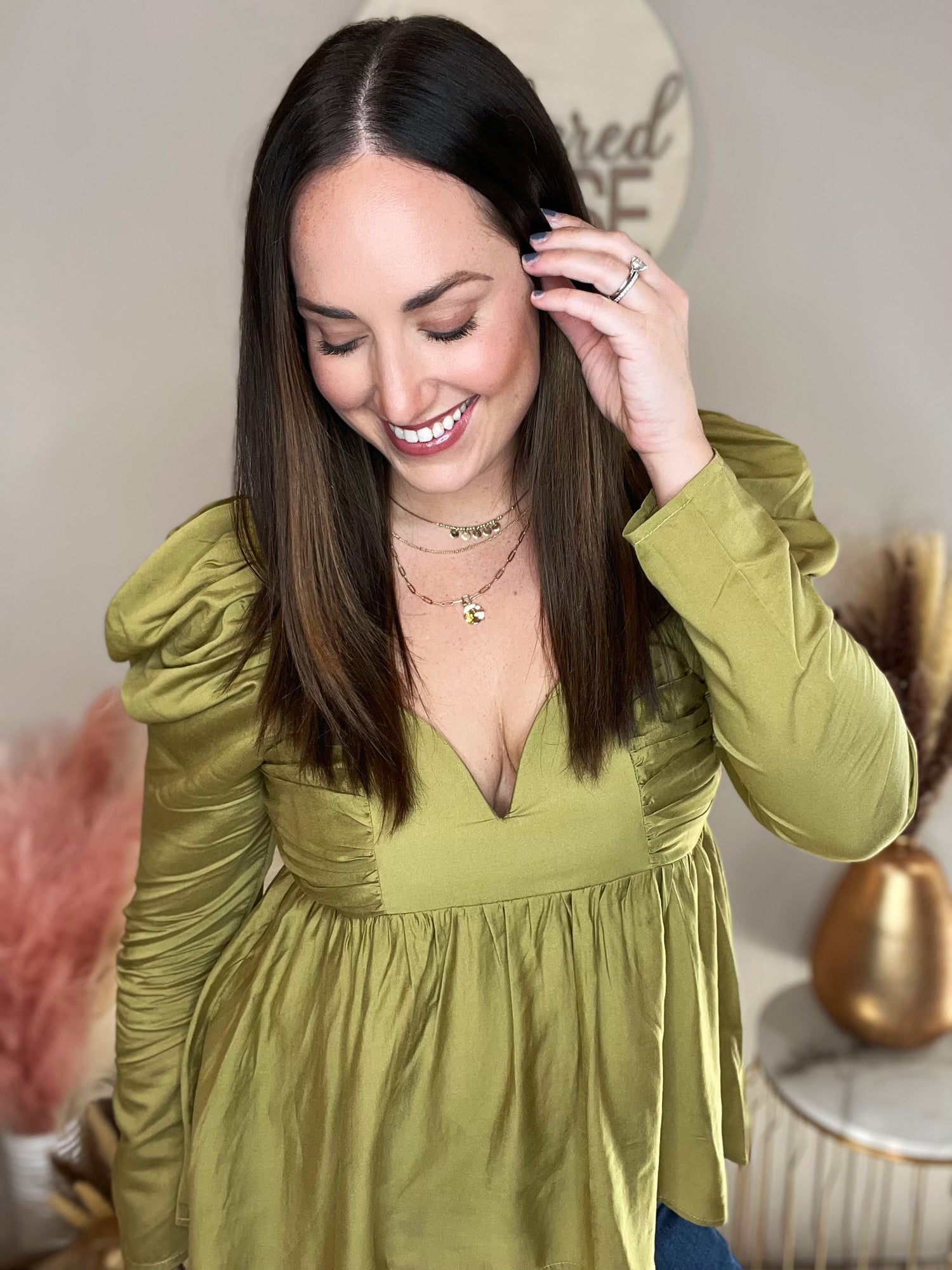 Call up the girls & get ready for a night out! This stunning martini olive colored babydoll top will be turning all the heads! The peplum silhouette is ultra-flattering and will make you feel like a million bucks. Pair with black denim & pointed toe heels for a chic & classy look - or keep it more casual in the spring with white shorts, sandals, and a boho hat!