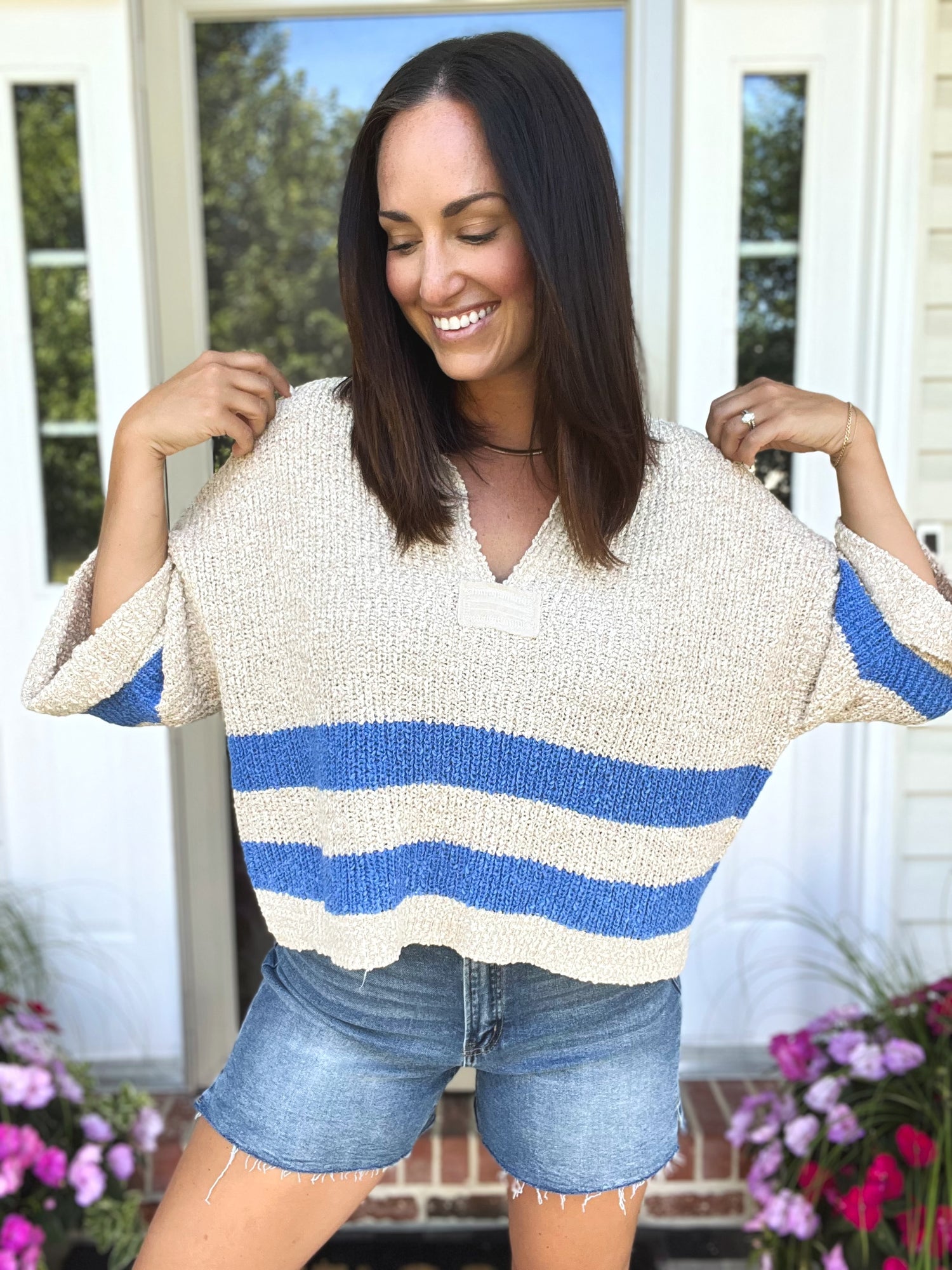 Elevate your wardrobe with the Simply Said Cropped Sweater. This loose-fitting sweater in natural sand with blue stripe detailing exudes effortless style. The slouchy, cropped design features a flattering V-neck and 3/4 sleeves for a relaxed yet chic look. Complete with solid patches at the front and back, this sweater is a must-have for any season!