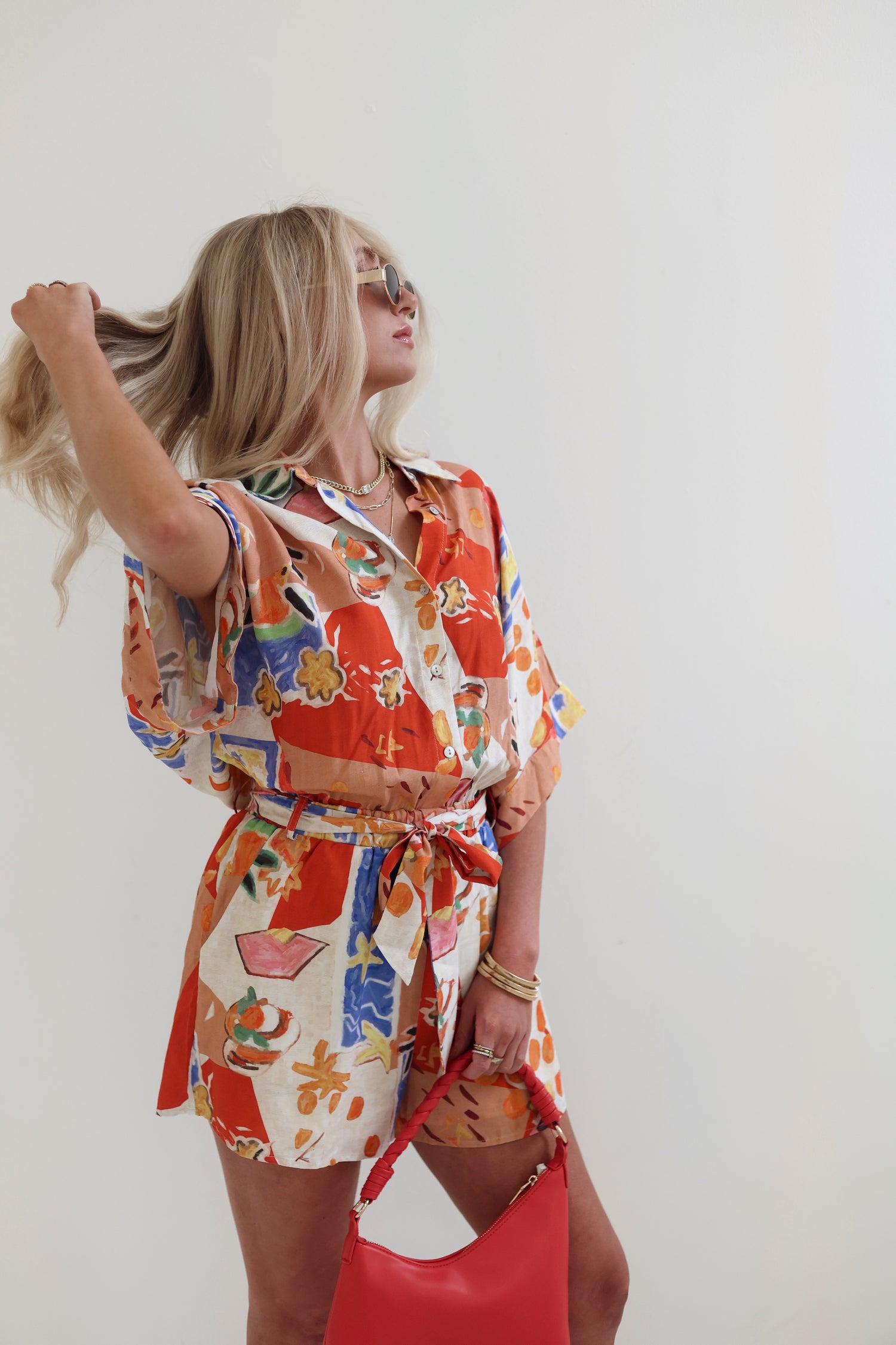 Bold, breezy, and absolutely unforgettable—the Sunkissed Splash Romper is your new summer obsession! With its vibrant, abstract print and effortlessly chic silhouette, this romper is made for sun-drenched days and spontaneous nights out. The lightweight fabric keeps you cool, while the button-up front and waist tie add just the right touch of flirty sophistication. Whether you’re strolling the streets of a coastal town or vibing at a beach side resort, this romper is your perfect plus-one. Just add sandals, a glowing tan, and a carefree attitude!