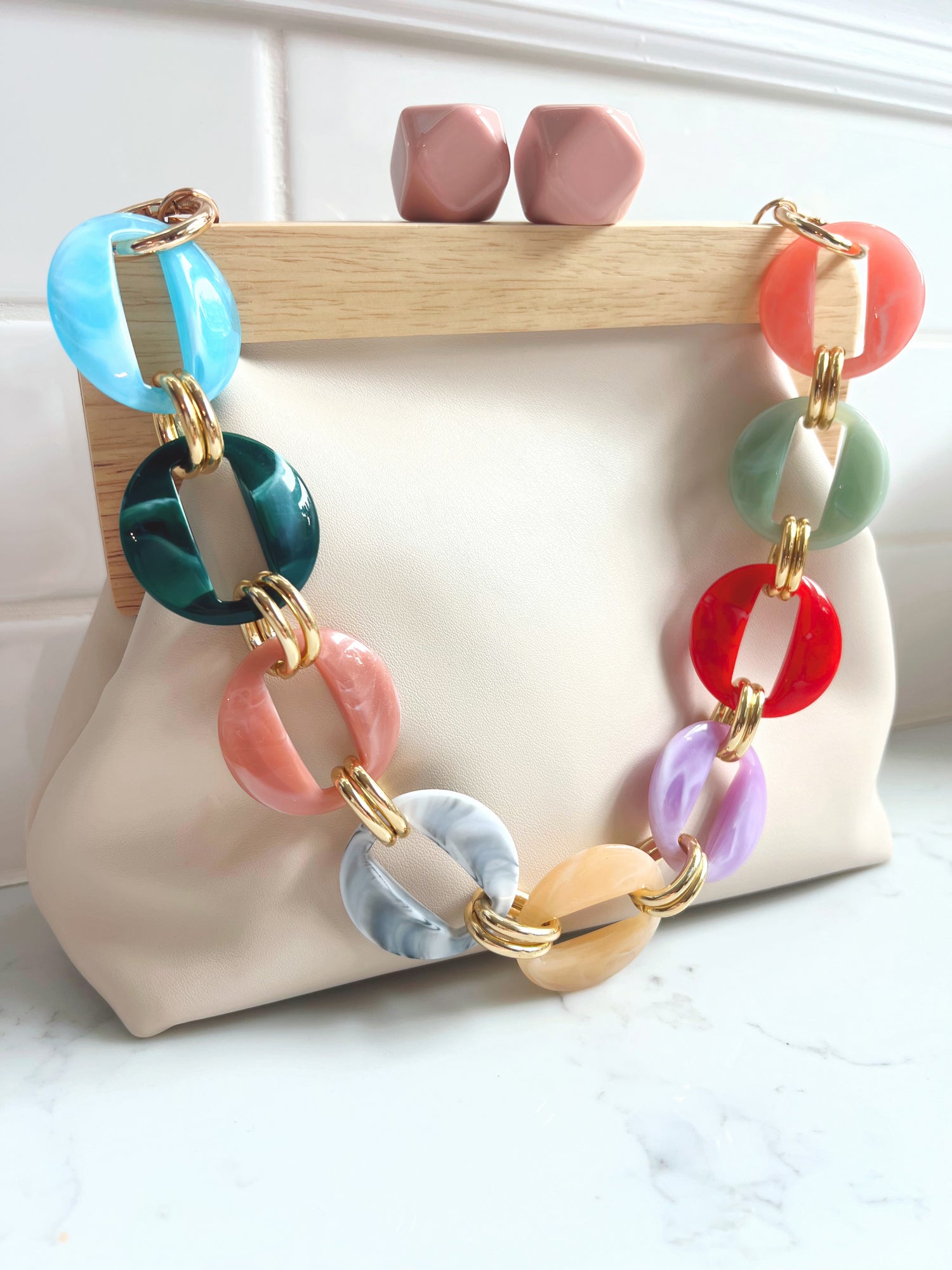 Introducing the Tallulah Evening Bag - the essential accessory for any summer night out! Crafted with a chic white leather exterior and a unique wooden clutch, it also includes a vibrant multi-color acrylic strap that can be adjusted to your liking. Plus, for added versatility, it comes with a glamorous gold chain strap that can be easily removed or attached. Elevate your style with this statement piece!