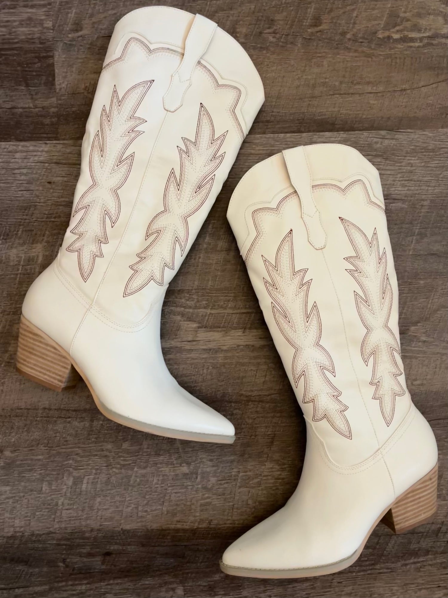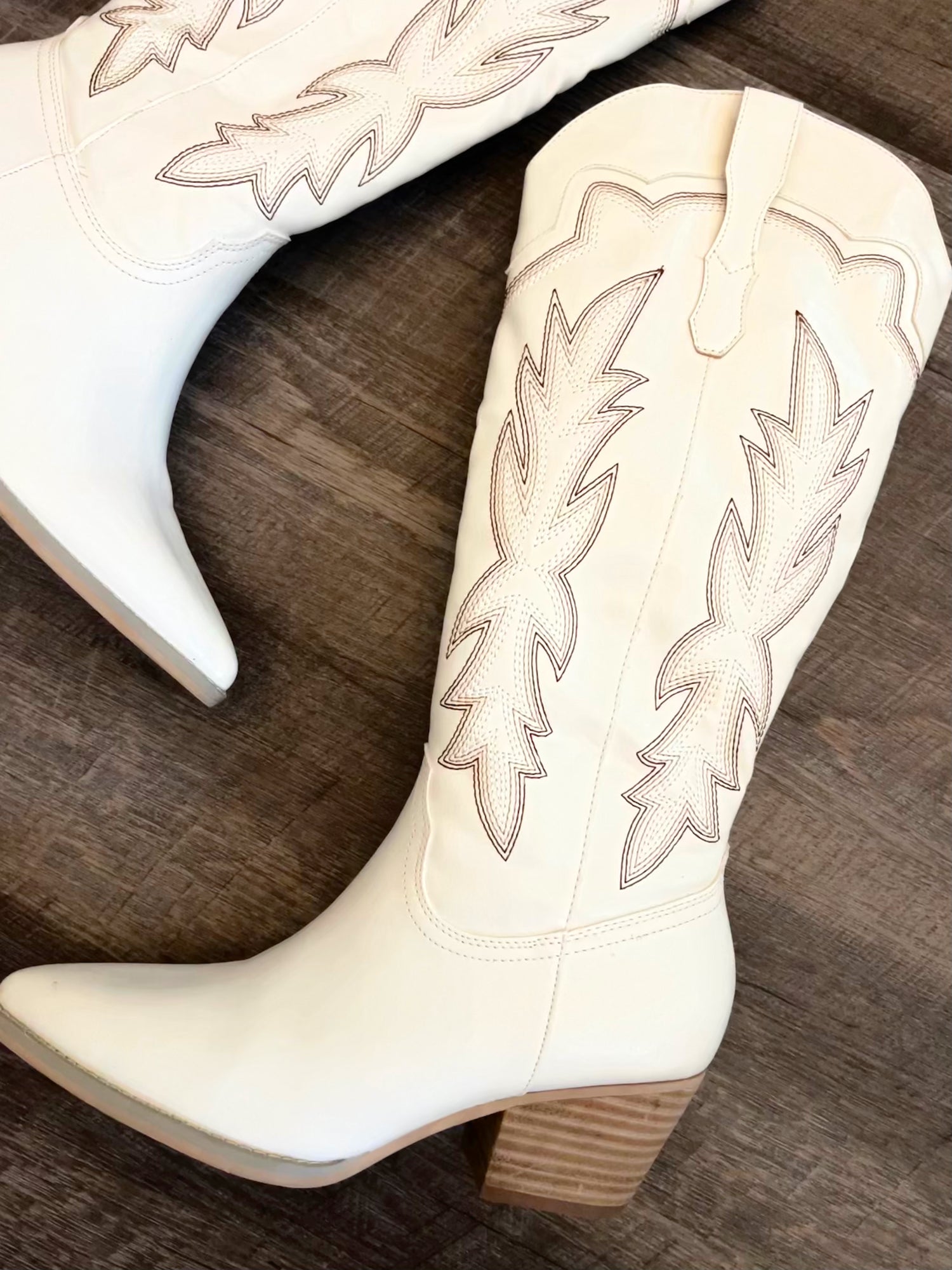 Elevate your style with these stunning Lacey Western Boots! Featuring luxurious white faux leather, an intricate embroidery design, and brown and tan stitching, these boots have the perfect mix of fashion and function. Plus, the soft suede lining and convenient side zipper make them extra comfortable & easy to put on and take off. Add a touch of western flair to your wardrobe and grab these boots today!