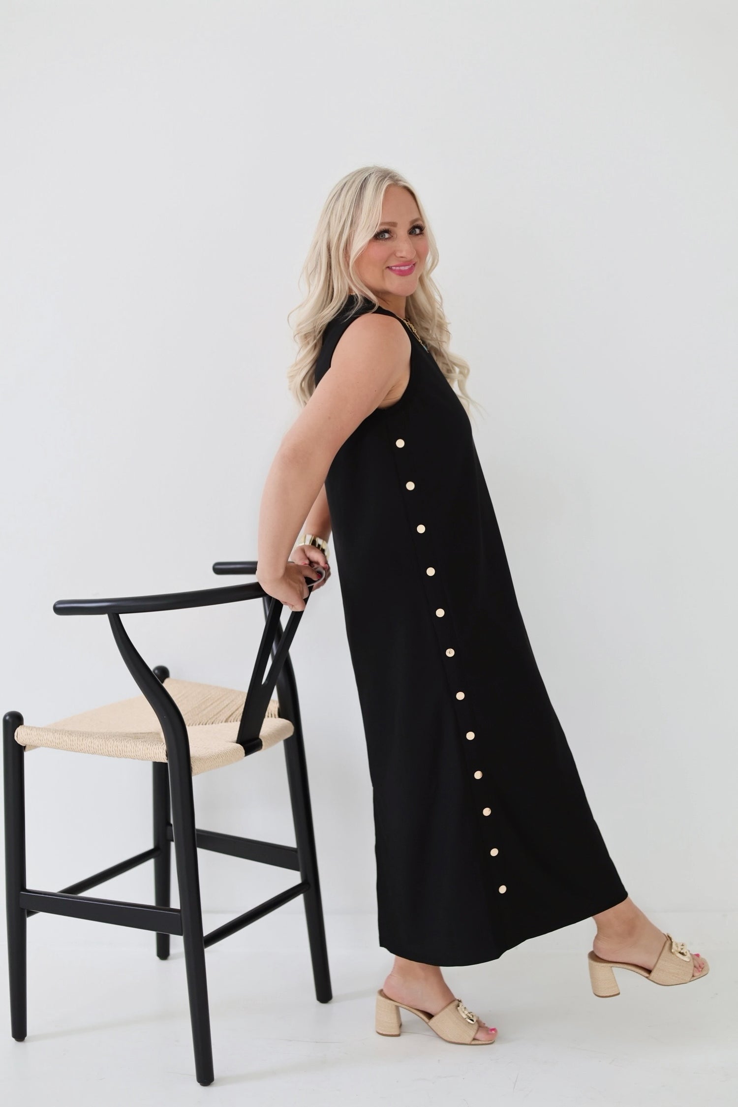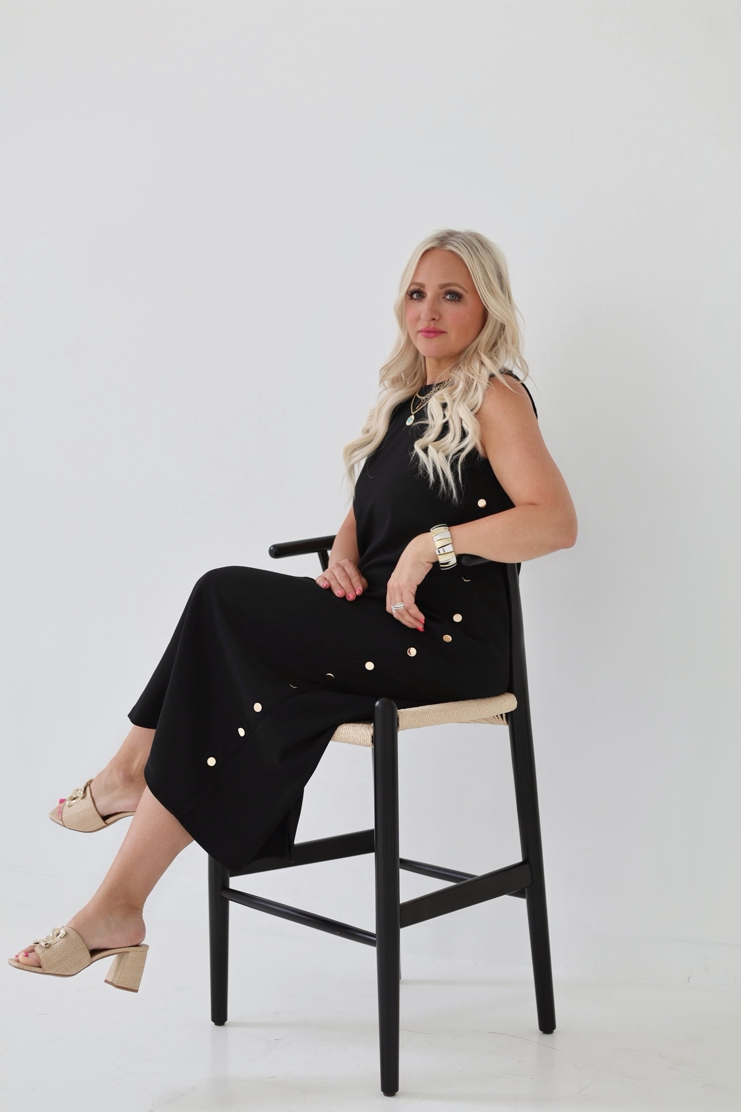 The standout feature? Elegant gold accent buttons running down both sides—adding just the right amount of shine and sophistication. Whether you’re heading to brunch, the office, or date night, Harper transitions flawlessly from day to night with ease and style.