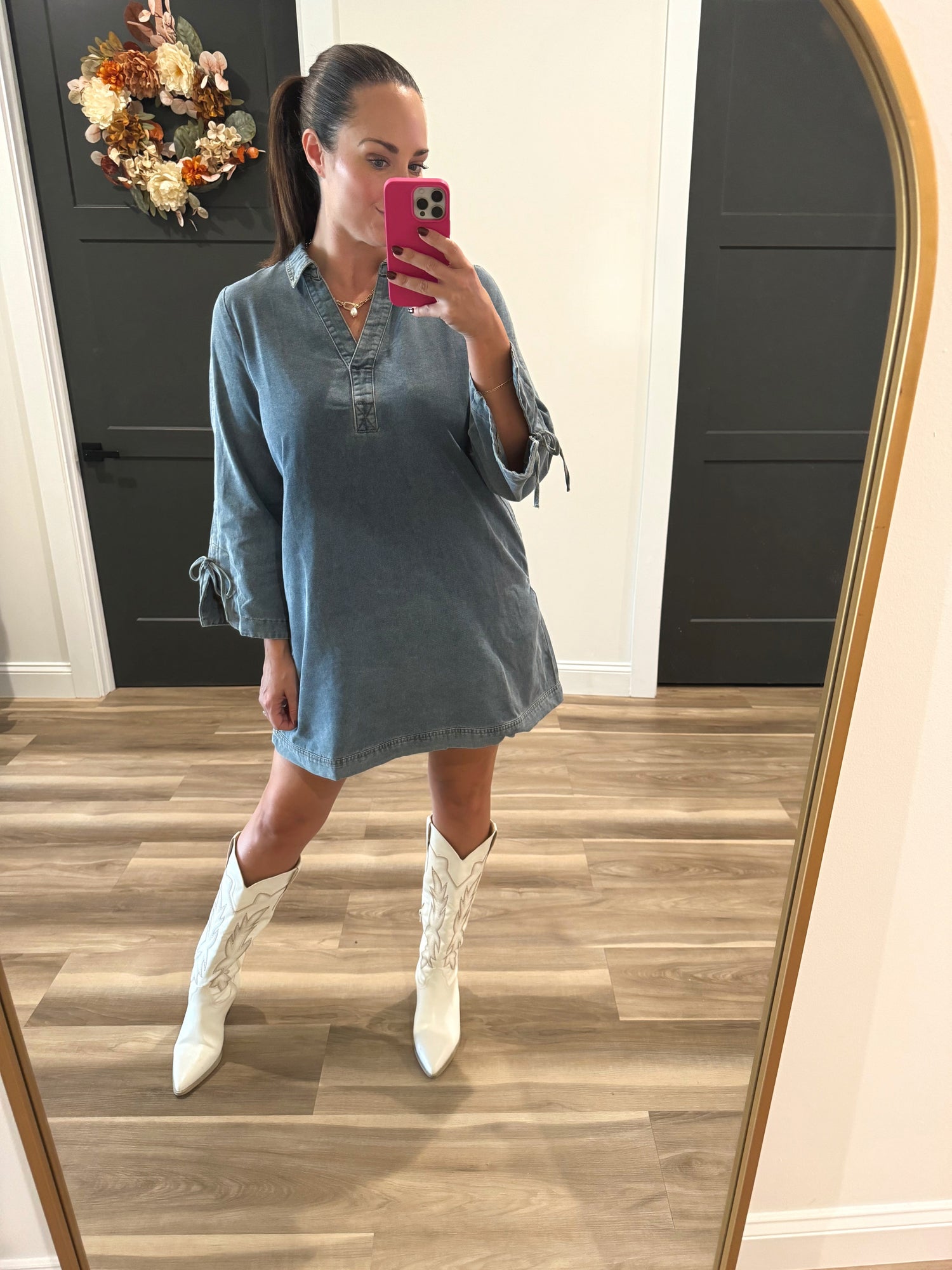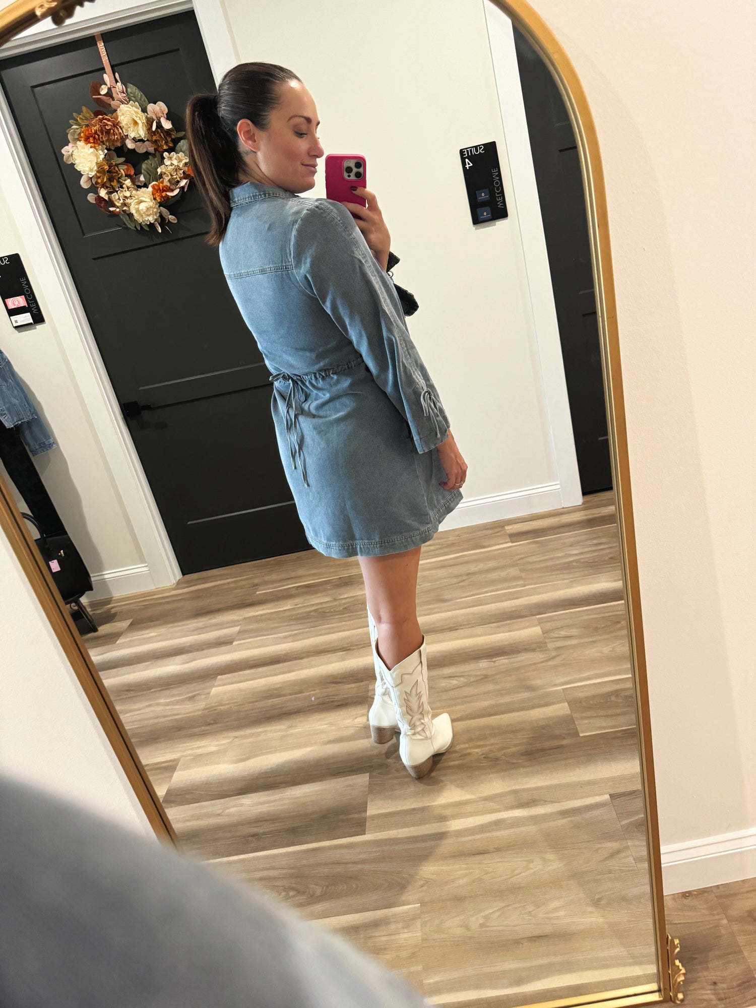 Effortlessly chic and oh-so-versatile, this denim dress is your new go-to for any occasion! With its relaxed fit and stylish tie-back detail, it’s perfect for everything from casual brunches to a night out. Pair it with your favorite boots or sneakers to create a look that’s all your own. Don’t miss out on this wardrobe must-have that blends comfort and style in the best way possible.
