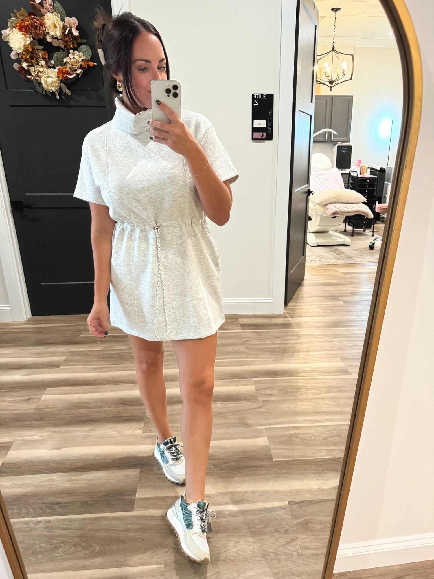 Get ready to elevate your casual style with this effortlessly cool athleisure dress. Designed with a soft, cozy fabric and a relaxed fit, it’s perfect for when you want to look put together without sacrificing comfort. The high-neck detail and adjustable drawstring waist give it a sporty-chic edge, while the short sleeves keep it breathable for all-day wear. Pair it with sneakers for a laid-back vibe or dress it up with some chunky accessories for a more polished look. Whether you’re running errands, meeting friends, or simply lounging in style, this versatile dress has got you covered.